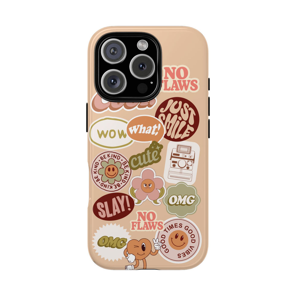 Cute Sticker Collage Phone Case – ’No Flaws’, ‘Cool’, ‘OMG’ Retro Vibes