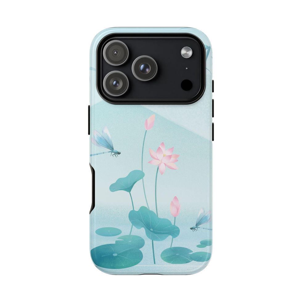 A slim, dual-layer protective phone case that brings a calm, watercolor pond to your everyday carry. Gentle lotus blooms float above soft teal pads while delicate dragonflies drift around misty hills and bamboo silhouettes. The serene palette and subtle texture feel like a quiet morning by the water — a little moment of calm every time you reach for your phone. Built to absorb shocks and resist outdoor wear, the case balances artful design with rugged protection so you can move through city streets, cafés, or weekend escapes without worrying about dings or scratches.