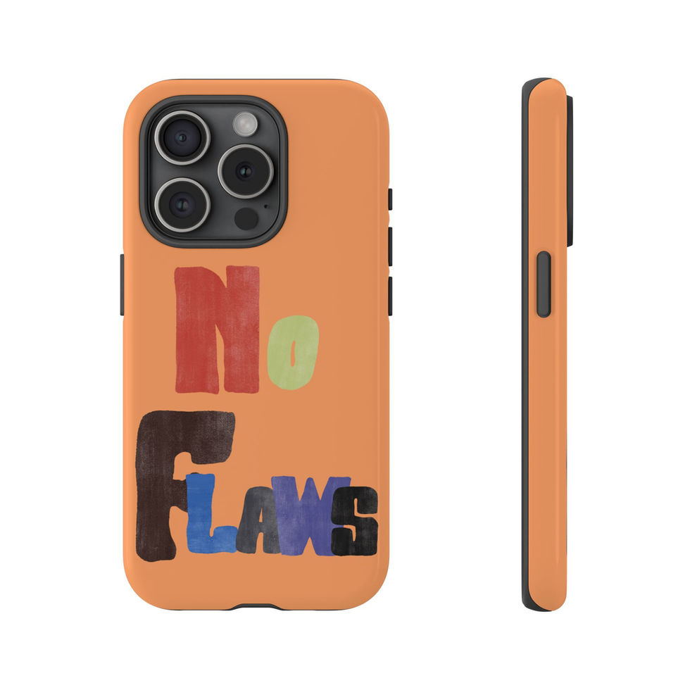 A sturdy, stylish protective phone case with a bold, hand-painted message: “No Flaws.” The dual-layer construction combines a hard polycarbonate shell with a soft TPU silicone liner to absorb shocks and resist everyday drops. The full-wrap print gives rich, saturated color across the entire surface while UV protection keeps the artwork vibrant outdoors. Slim profile, clear port openings, and wireless-charging compatibility keep the case practical for daily use. Lightweight but protective, it brings a playful, confident vibe to your phone while meeting rigorous safety and material standards.