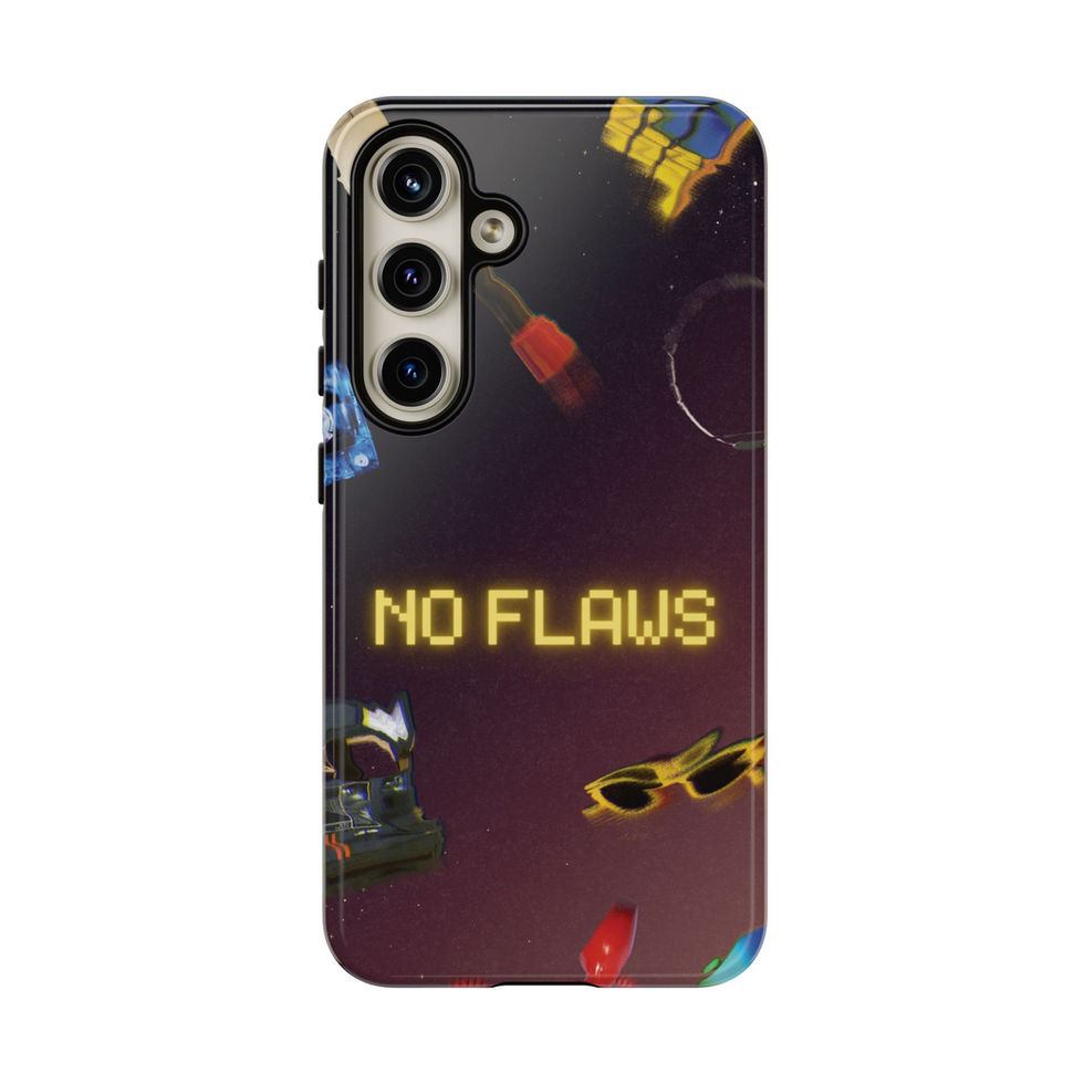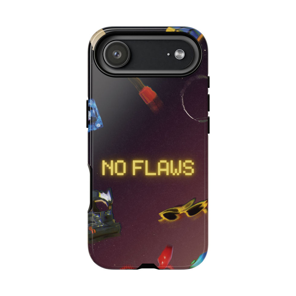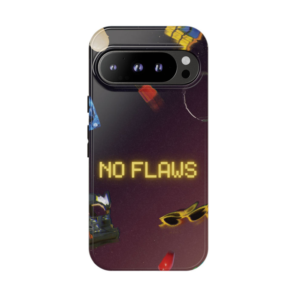 Slip this protective case onto your phone and carry a little confident, playful attitude everywhere you go. Rich, full-wrap printing shows scattered retro icons — shades, lipsticks, tiny gifts — and a glowing pixel-text message that reads NO FLAWS. The deep, moody gradient background makes the yellow text pop while the glossy or matte finish keeps colors vivid. Built with a rigid polycarbonate shell and soft TPU liner, it soaks up shocks and resists everyday wear while keeping ports open and wireless charging available. It’s designed for adults who like nostalgic, slightly tongue-in-cheek style and want reliable protection without losing personality.